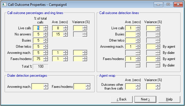 You will recall from Setup and Talk Properties that when an agent finishes a live call, there is provision for a wrap period to follow immediately. Wrap may also be required for all other calls that get connected to the agent. The agent may spend a second or more detecting what kind of connect he has, and this will be recorded as detection time. Once the call has been terminated, the agent will probably want to make a note of what happened, and set a future action for that number. The time taken to do this is wrap time (Fig. 6), and is recorded on this page as a single average value, with a variance.
