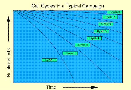 Each telephone number in a calling list may be 'recycled' i.e. called, a number of times. Each successive occasion, starting with the first can be thought of as Cycle 1, Cycle 2 and so on. Some telephone numbers may be on their 5th calling cycle, while others have only had one. For example, this would be true of busies, which get recycled quickly, as against no answers. This is not always easy to visualize, and Fig. 2 below will give you a good idea of how this works.