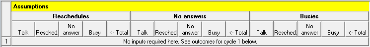 The starting point is call outcomes in the current cycle, beginning with cycle 1. Three are considered: Reschedules, No answers and Busies. For each of these outcomes, you may forecast what the call outcomes will be in the next cycle. The same three call outcomes are possible, and there is a fourth as well, which we call Talk. This fourth category comprises all live calls except reschedules, and will end in either a Result or No Result, in the call outcomes in the bottom half of the page.