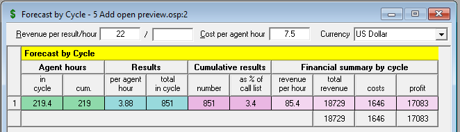 The first column ('per agent hour') shows the number of results achieved per agent hour in a cycle. This is a good measuring stick to use for your campaign, to be sure that you are getting your assumptions in the right range.