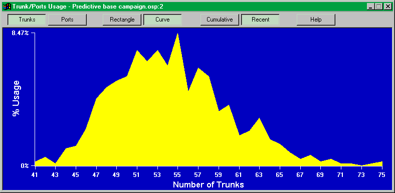 The number of trunks most frequently used in the hour is approximately 55, and the percentage of time this number was used during the hour is shown as 8.47%.