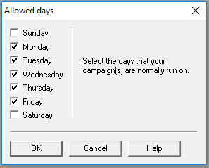 The Work Scheduler option on the Options menu lets you screen out days that you don't want to work on, so that when you schedule agent hours, by whatever time period, these days are ignored as standard. This is a setting that will apply to all campaigns you run. Here's how it works: